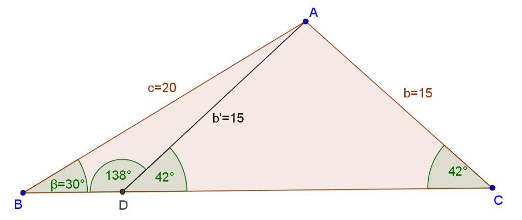 However, angle 138° has the same sine as angle 42°, i.e. sin138°=0.667, so this problem has two solutions.