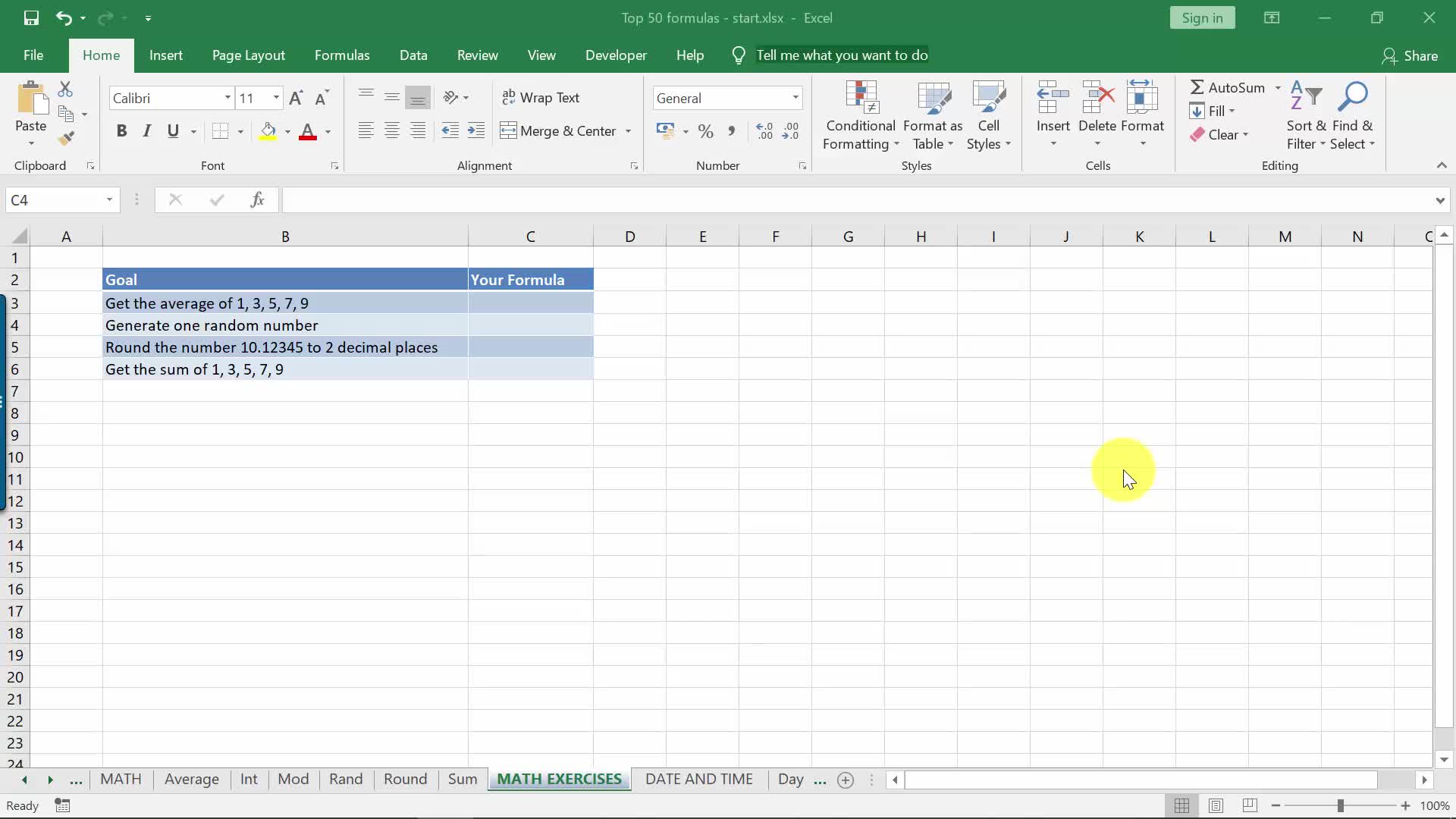 Microsoft Excel Formulas Math Exercise
