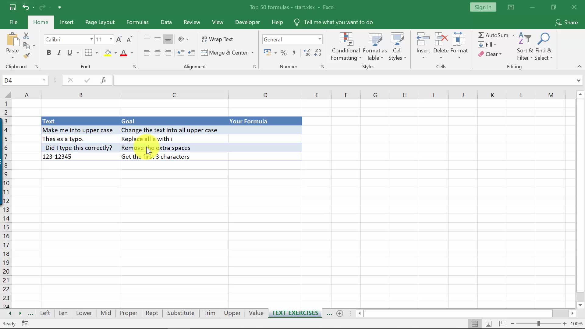 Microsoft Excel Formulas Text Exercise